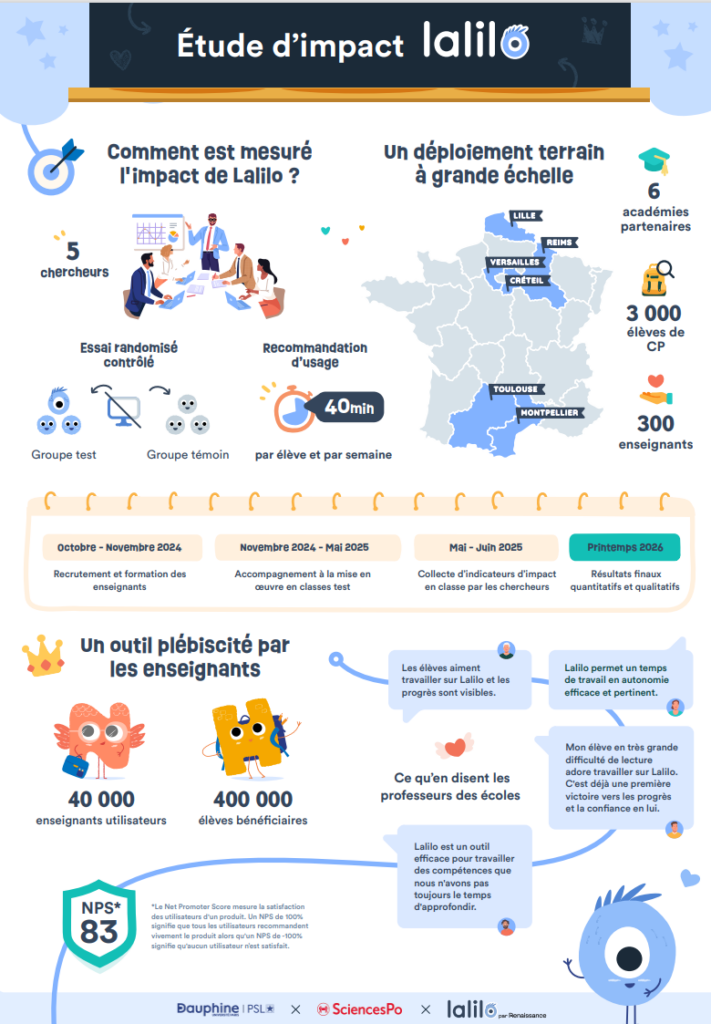 C’est aussi le lancement de la première étude d’impact à grande échelle en France avec les chercheurs de Sciences Po et de l’université Paris-Dauphine ; une étape clé pour mesurer scientifiquement les effets de Lalilo sur les apprentissages.